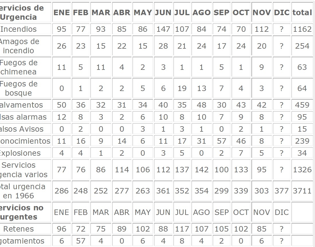 Si hay algo que llama la atención en este periodo de tiempo, son las estadísticas, la duración de los incendios y servicios, los números que aparecen en la Memoria de servicios y actividades realizadas en 1966 por el Cuerpo de Bomberos de Barcelona publicados en la revista Alarma en comparación con los de la Memoria del año 2005 (la memoria del 2006 todavía no está disponible)