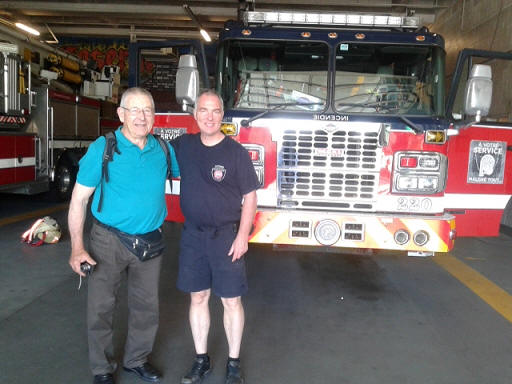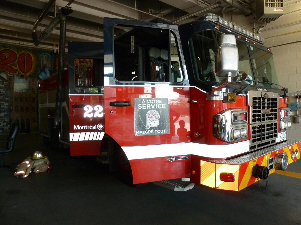Cerca del primer hotel donde nos hospedamos había un parque de bomberos por lo que aproveche uno de los pocos momentos libres para visitarlo y realizar las preguntas típicas, que tipo de vehículos empleaban, que horarios de trabajo tenían, como distribuían las tareas de parque, y todas esas cosas que acostumbramos a preguntar, pero con el idioma de signos ya que no tengo idea del ingles, y la prueba está en que dentro de la charla, me dieron el número 62, que yo entendí que habían 62 bomberos de servicio para toda la ciudad de Montreal, pero al momento me corrigieron, ya que no se referían a bomberos sino a parques de bomberos.
