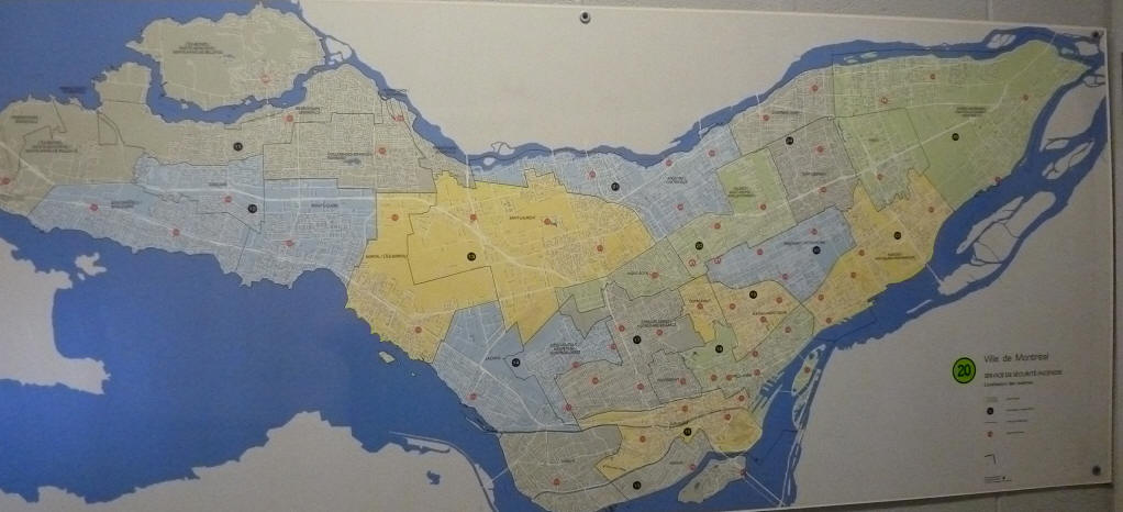 Montreal ciudad con 1.705.000 habitantes(en 2017) El servicio de bomberos de Montreal dispone de 62 parques de bomberos para cubrir la superficie de la ciudad con diferentes dotaciones en cuanto a vehículos y personal. En todos los parques visitados coinciden en señalar el tiempo de un minuto como tiempo máximo para la salida del parquesumando un total de cinco minutos desde el aviso hasta la llegada al lugar del siniestro. La dotación de este parque (Fire Station nº 20) disponen de un Snorkel y un Bomba Tanque de con 2500 litros de agua y ante un incendio de estas características envían dos vehículos que suma una dotación de siete bomberos. Según la localización del siniestro envían vehículos de sub parques con lo que se aseguran la llegada en el tiempo previsto.