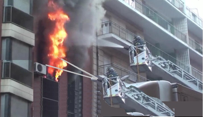 Situando la cesta a un lado y por debajo de la planta en llamas permitirá que todo el chorro de agua se transforme en vapor al impactar contra el techo (donde se concentra el humo más denso y la mayor temperatura) al tiempo que reducirá la posibilidad que una eventual deflagración pueda alcanzar a los bomberos que se encuentran en la cesta.