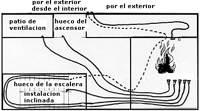 El patio de luces que se encuentra en algunos vestíbulos y que comunica en vertical las plantas a través de ventanas de ventilación, también pueden ser el hueco por donde hacer bajar el extremo de las mangueras hasta la ventana más baja, y que habrá que continuar hasta unir a la bomba.