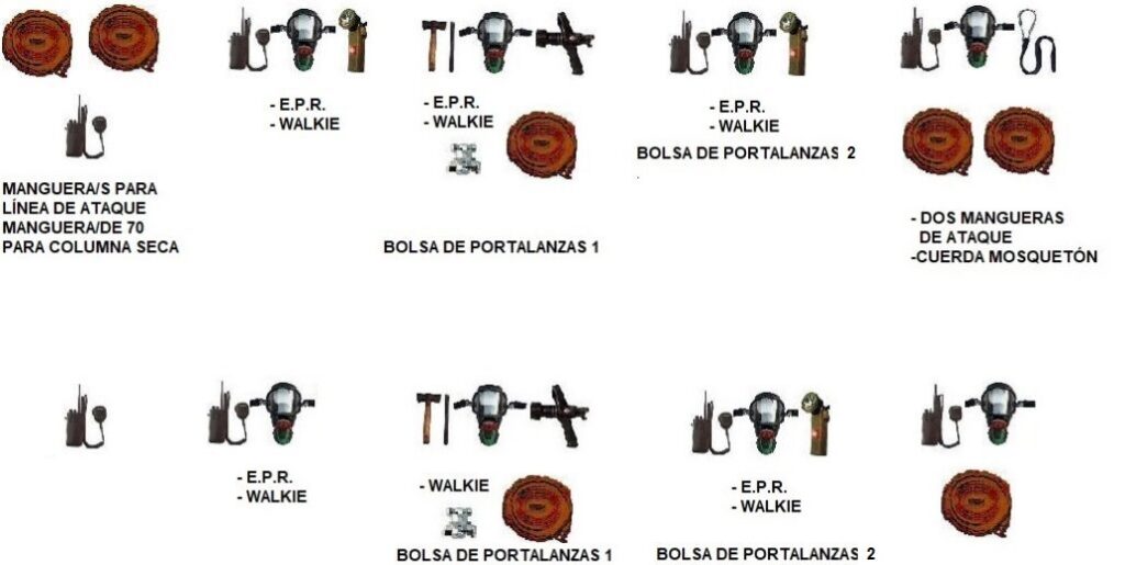 | *WALKIE ES EL RADIOTRANSCEPTOR | *E.P.R. SE COMPONE DE-EQUIPO DE RESPIRACIÓN AUTÓNOMO COMPLETO-MASCARA FACIAL-LINTERNA-CAPUCHA DE SALVAMENTO | * LA BOLSA PORTALANZAS CONTIENE-UNA MANGUERA DE ATAQUE-UNA PISTOLA DIFUSORA-UNA REDUCCIÓN A 25-UNA MACETA UNA ESCARPA | * E.R.A. o E.P.R.ES EL EQUIPO DE RESPIRACIÓN AUTÓNOMO COMPLETO CON MASCARA FACIAL y CAPUCHA DE SALVAMENTO | PUEDE PASAR A FORMAR EQUIPO CON EL BOMBERO ALIMENTACIÓN DEL TANQUE PESADO |