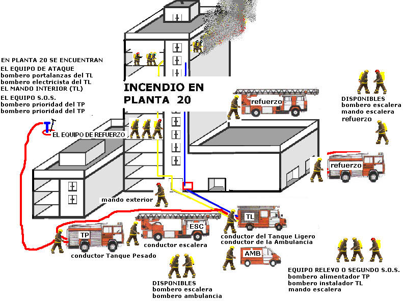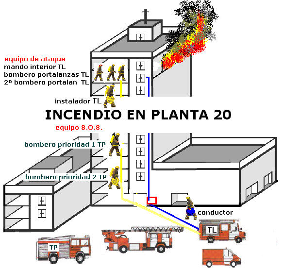 A la llegada al lugar, la dotación del tanque ligero acude al punto de reunión con las mangueras enrolladas, desde donde se iniciaran la instalación de manguera hacia abajo, en vertical y se preparan para iniciar el ataque. Al mismo tiempo que el equipo prioridad del tanque pesado ejercerá ya de entrada como equipo S.O.S, acudiendo en segunda posición tras sus compañeros los portalanzas del TL. e Iniciarán la instalación de ataque desde abajo hacia arriba, en busca del extremo de la manguera que está bajando el instalador del TL.