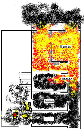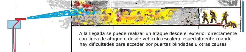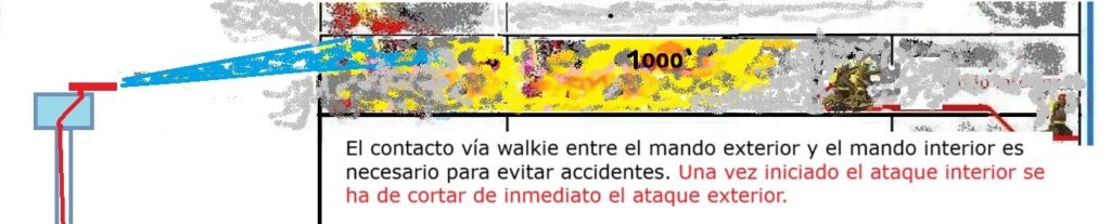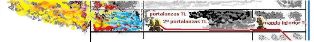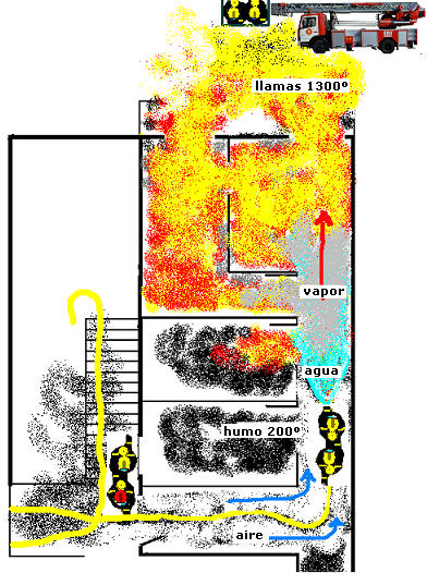 Entramos agachados, hay mucha temperatura, no se ve nada, al final del recibidor giramos a la izquierda, abrimos la lanza en posición pulverizada y podemos ver como el humo y la temperatura van hacia delante, entrando aire por detrás nuestro, mantenemos esta posición durante un minuto escaso y hacia el fondo ya apreciamos el resplandor de las llamas que se intensifican por el aire aportado.