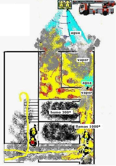 Si en ese momento desde el exterior obstaculizan o lo que es peor dirigen chorro más potente hacia las ventanas, el proceso se invierte, se aumenta el vapor, la temperatura y llamas rebotan hacia atrás atravesando y transformando en vapor incluso el chorro difuso de la lanza lo que aumenta la temperatura de forma brutalmente insoportable