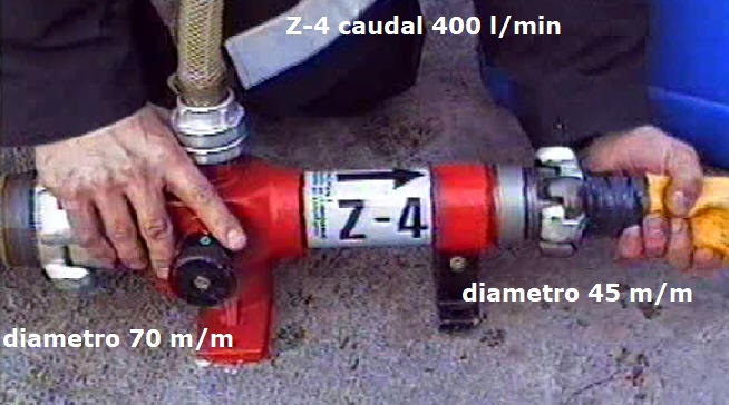 Un proporcionador situado en esta línea, produce por Venturi una depresión que absorbe el líquido emulsor llevándolo hasta la entrada de la bomba para que esta lo mezcle y lo envíe a presión hacia las mangueras.